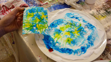 | Die Arbeits-Gruppe Marmorieren. Hier lernst du eine besondere Mal-Technik mit Farben. Das ist kreativ. | |